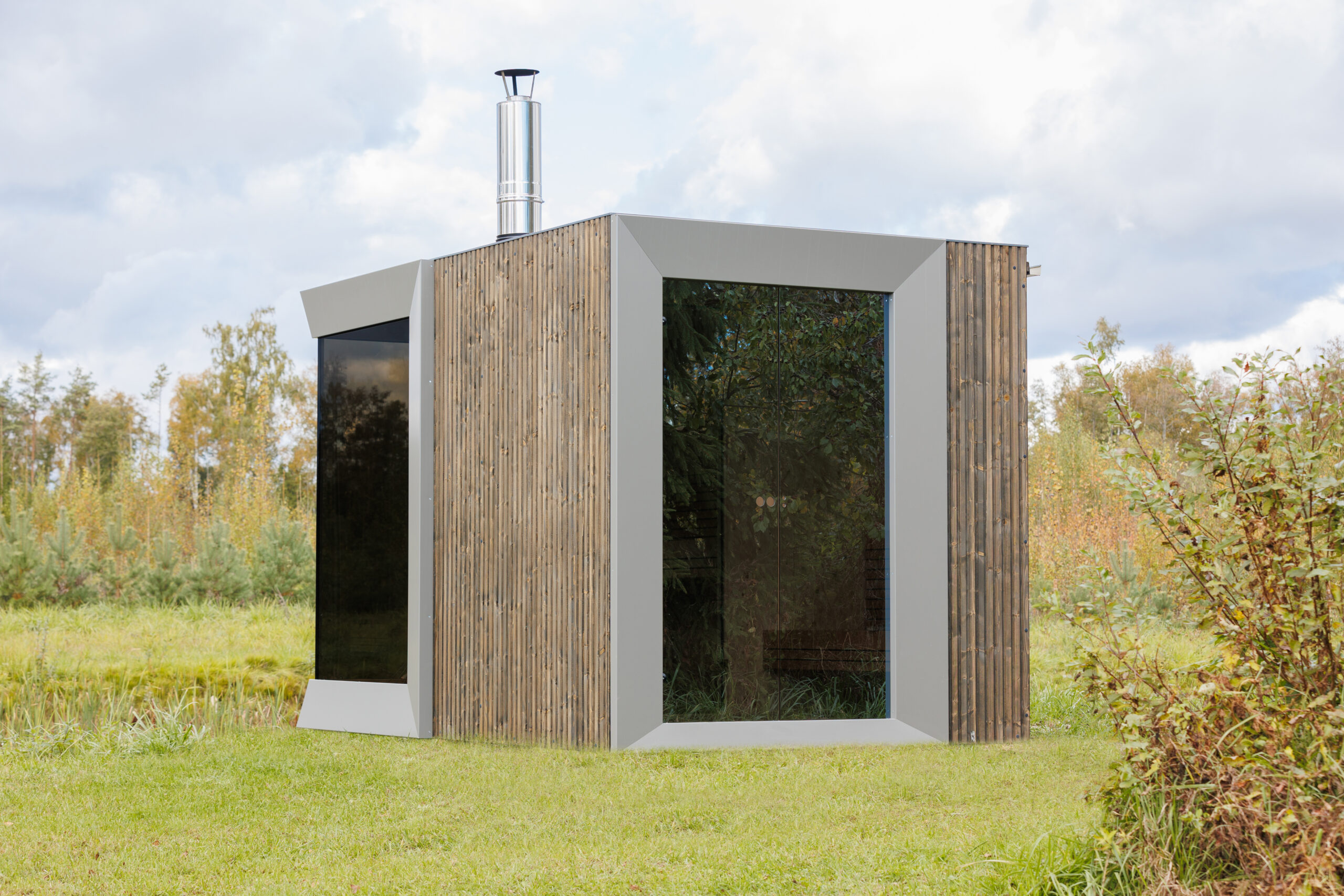 Meie uus täisfunktsionaalne moodulsaun kahe suure põrandast laeni akna ja duširuumiga.